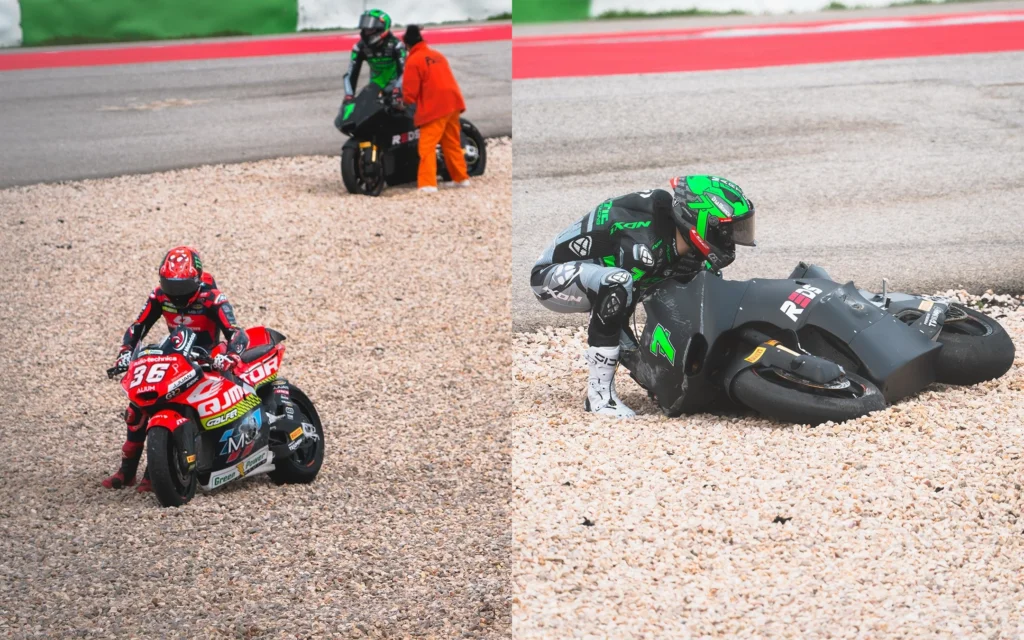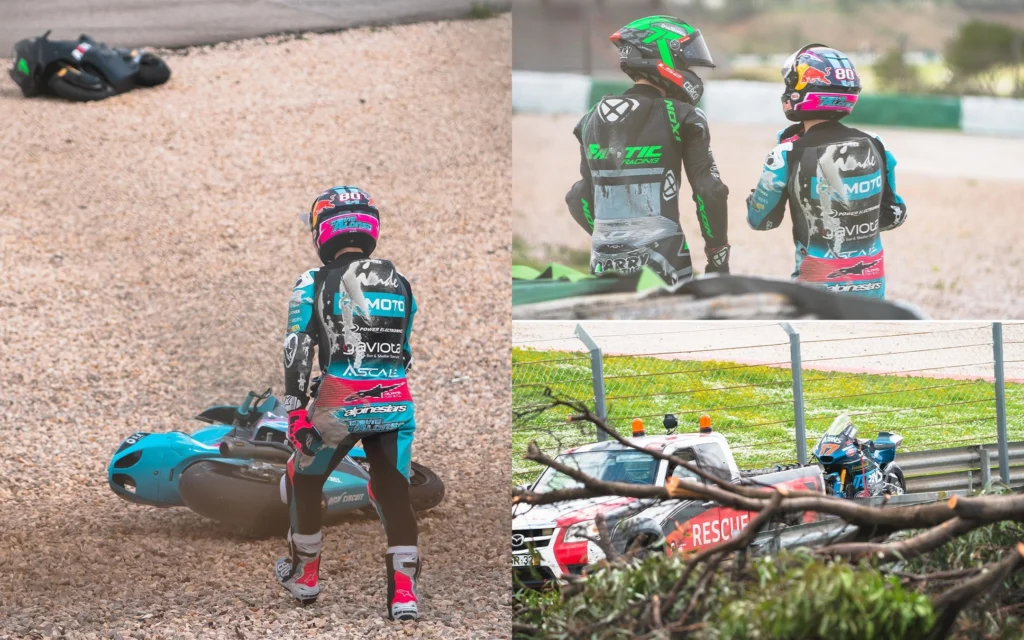 Piste yayılan yağ nedeniyle birçok pilot kontrolünü kaybederek kendini yerde buldu. Zincirleme kazadan etkilenen isimler arasında, takım arkadaşı Aron Canet ve David Alonso gibi favori isimlerin yanı sıra genç yetenekler Mario Aji, David Munoz ve Angel Piqueras yer aldı.
