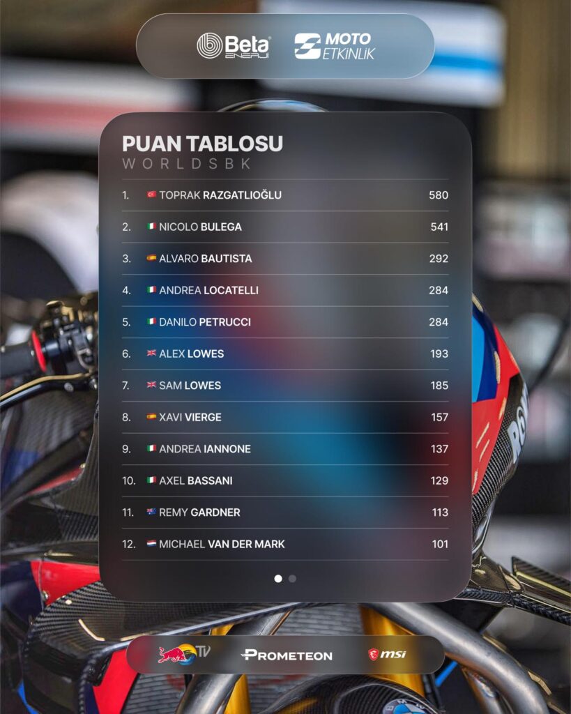 Milli sporcumuz BMW pilotu Toprak Razgatlıoğlu’nun üçüncü Dünya Superbike Şampiyonluğu için artık gün sayıyoruz! Red Bull sporcusu Toprak, rakibi Nicolo Bulega karşısında sezonun bitimine bir yarış kala puan farkını 39’a kadar çıkardı!