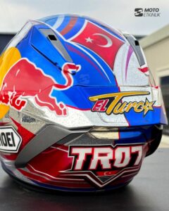 Shoei X-SPR Pro modelini kullanacak olan Toprak, eski yıllardaki tasarımlara benzer bir görüntüsü olan ancak yeni logosu TR07 ve Pramac Yamaha’ya özel yeni renklerle tasarlanan ayrıca Türk bayrağımız ile buluşan bu kaskta bir kez nefis bir tasarıma imza attı.
